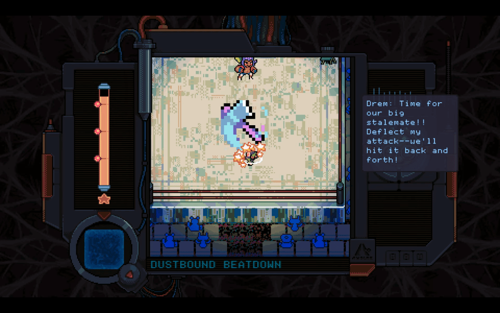this transformation paves the way for other changes. just as palisade wanted, nova learns how to play. in the dustbound beatdown, nova reclaims her bodily autonomy through performance. under a new identity, the weedoron witch, nova finds pleasure moving in ways we’ve never seen before, cheered on by an adoring audience. walking and vacuuming are a familiar part of nova’s repertoire, but now she jumps to whack her opponent; then she mimes being struck herself; and finally, she twirls magnificently to deflect oncoming attacks. her laboring limbs find renewed purpose in sport and theater and dance. in the space of this seemingly tangential minigame, we see this pixelated body experiencing its first taste of freedom.