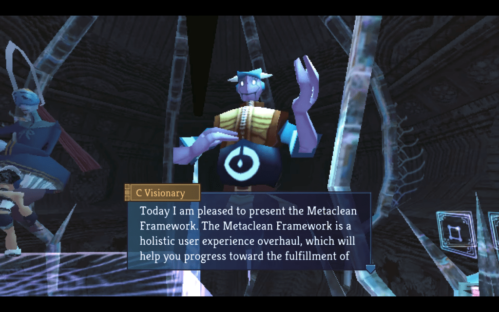 where psalmist tried to control nova by confining her to a strict moral system, in which she had to work to suppress her “evil” impulses out of guilt and shame, visionary’s approach is to evade this moral tension entirely. visionary’s method embraces nova’s (or more accurately, the player’s) “base” desires: he incentivizes nova to continue cleaning by scattering metacoins throughout the realm, which can be used to purchase info logs and other world lore from the metaclean manual. this technology-driven approach preys on your desire for accumulation and game completionism.