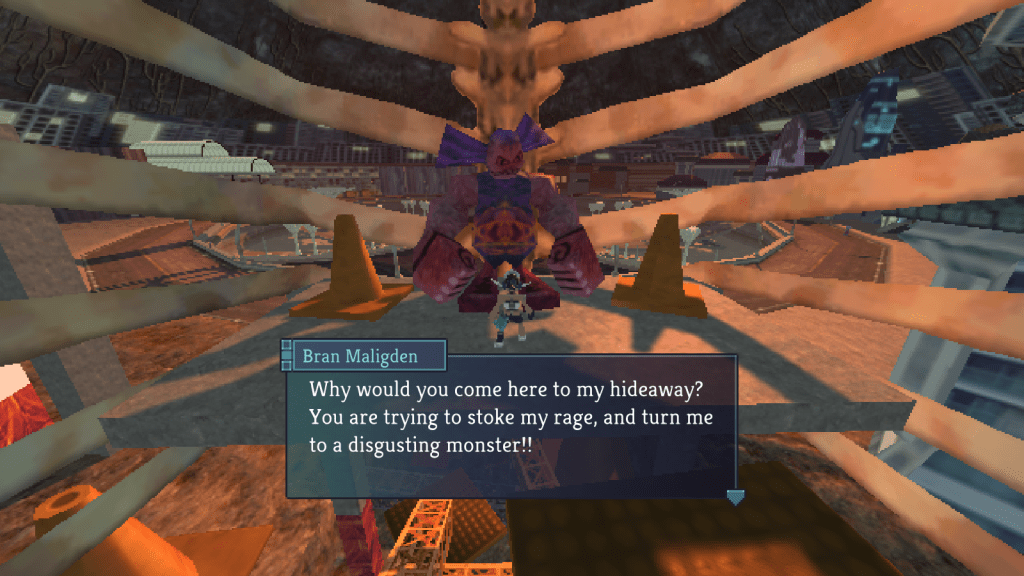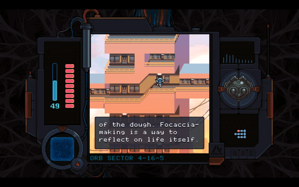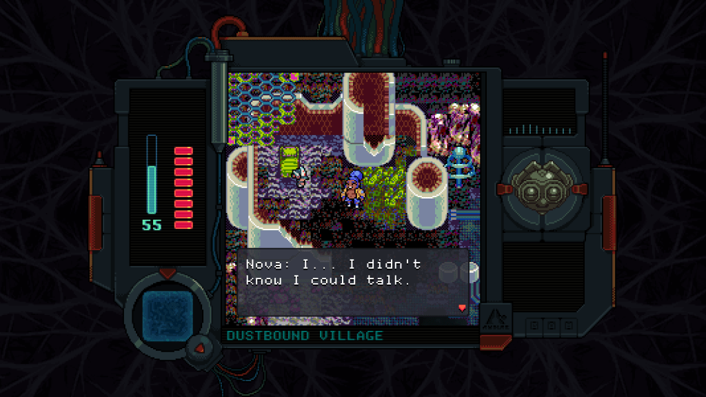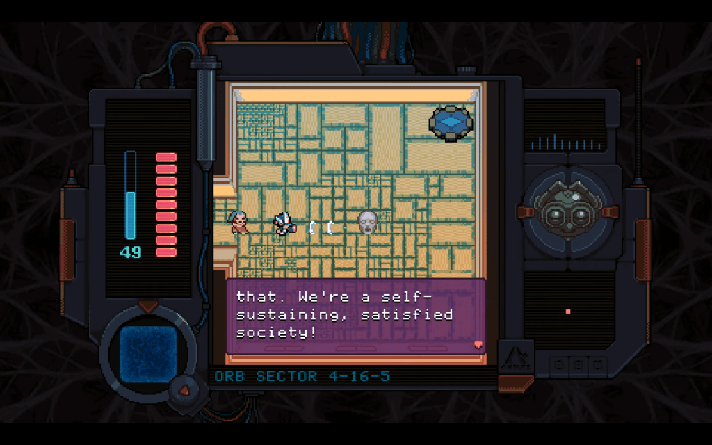 nova’s exhaustion resonates clearly with the plight of the worker under capitalism. but i also think there’s a buried reading here about gender and queer repression. gender isn’t something explicitly codified in anodyne 2’s world. however, i don’t think it’s a stretch to say that the center’s rigid and binaristic moral system, as well its castigation of anything that violates the center’s narrow definition of propriety, borrows from christianity’s discourse on purity and sin, and its repression of “deviant” expressions of gender and sexuality. the center’s confinement of nova into the role of nano cleaner seems to me no different from how systems of control (religious and otherwise) socialize and confine people in/to oppressive social roles in general.