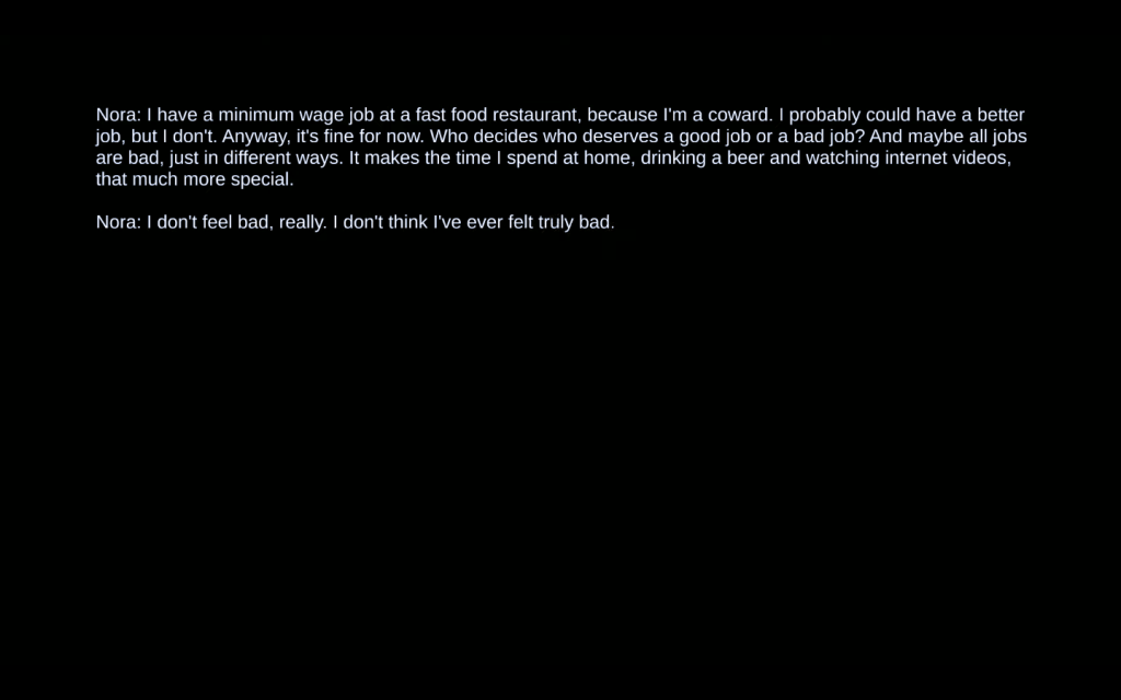 in response to her mother’s emotional abuses, nora has built up a detachment; this feeling of detachment pervades her life and is compounded by her experiences as an exploited fast food worker. throughout no such scene, we get the sense that nora feels thoroughly disconnected from her work, her emotions, and her social life. “i’ve never felt truly bad,” she assures herself, giving voice to her numbness.