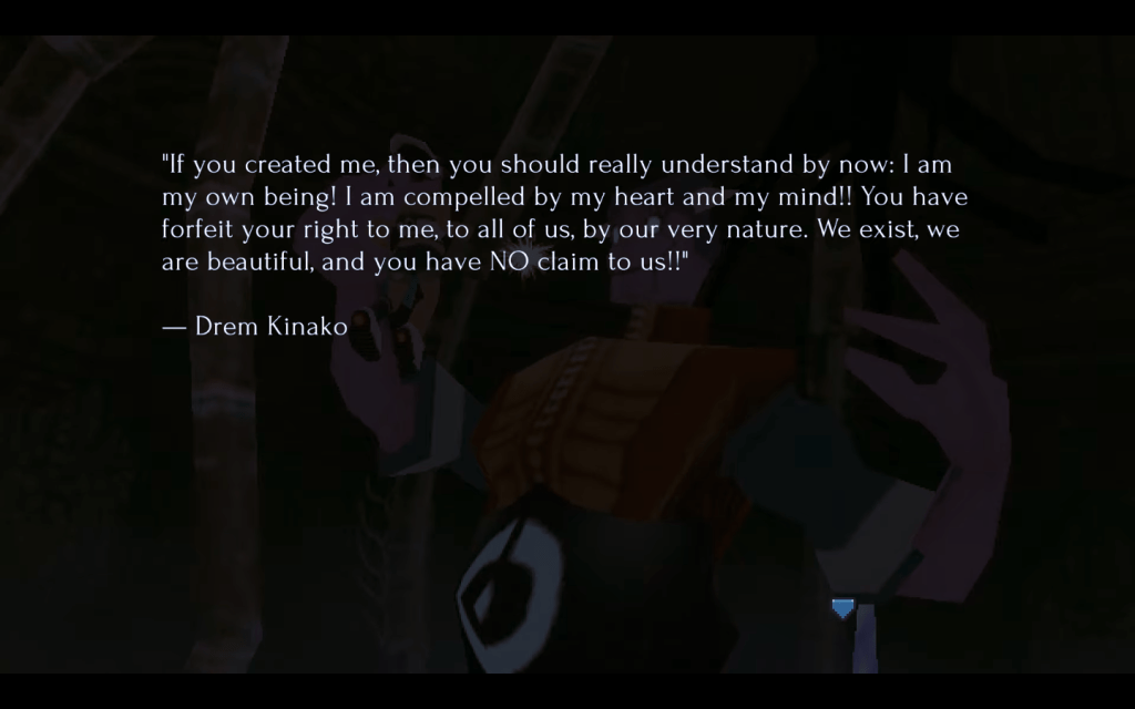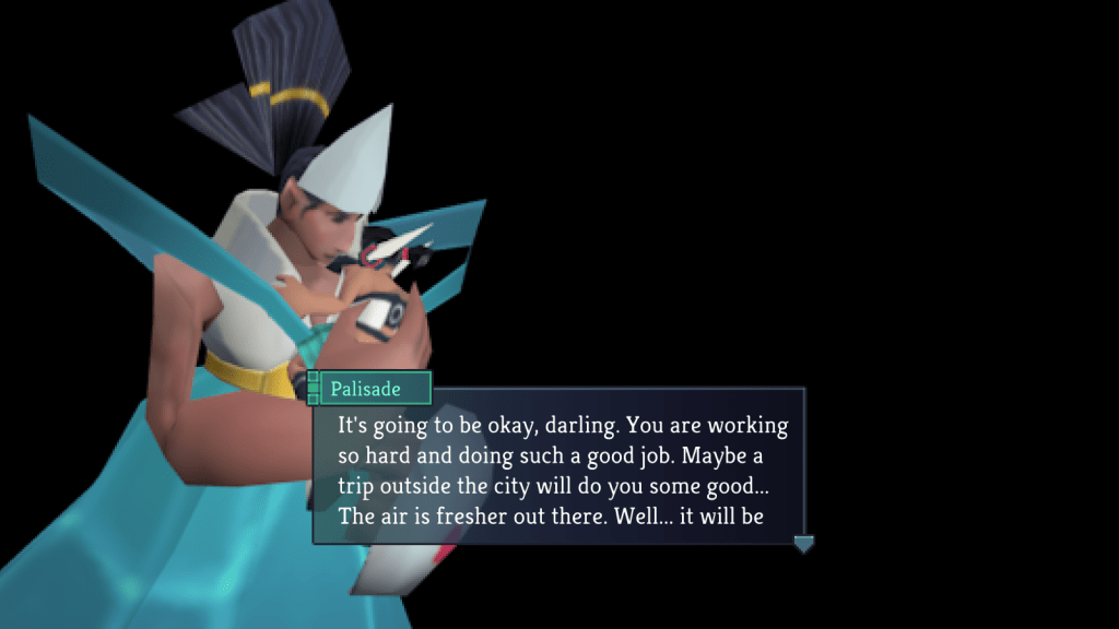 what rings true about nova’s predicament is that there is explicitly no distinction between the personal and political. these two levels on which ano2’s narrative operates–a “personal” story about familial trauma and a “political” allegory about labor and imperialism–are really the same. psalmist and palisade act as nova’s parents, but simultaneously function as her workplace supervisors, surveilling her progress and keeping her productive. subsequently, nova’s decision to confront the center arises not only from a desire to rebel against her controlling parents, but also a refusal to be complicit in the imperial violence of the center.
