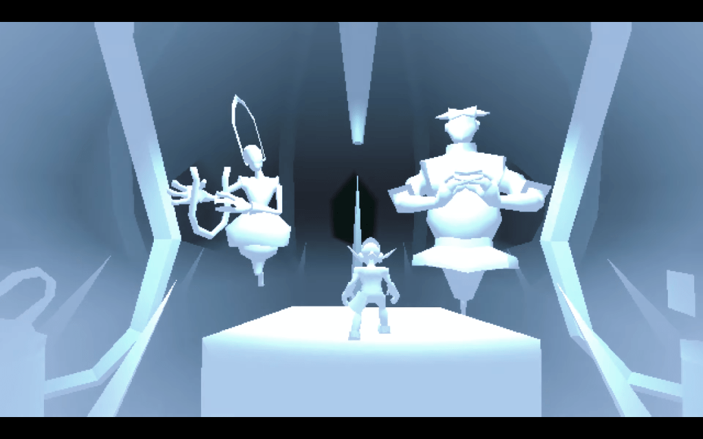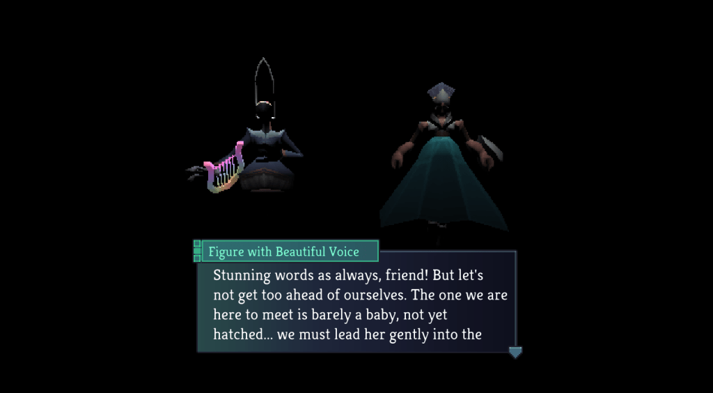 from the darkness, a being emerges, her entrance heralded by three flourishes of the lyre. she begins to share her musings with you, which are abstract and theological in nature. the lyre is plucked in a drifting, austere melody, the notes falling like drops.
