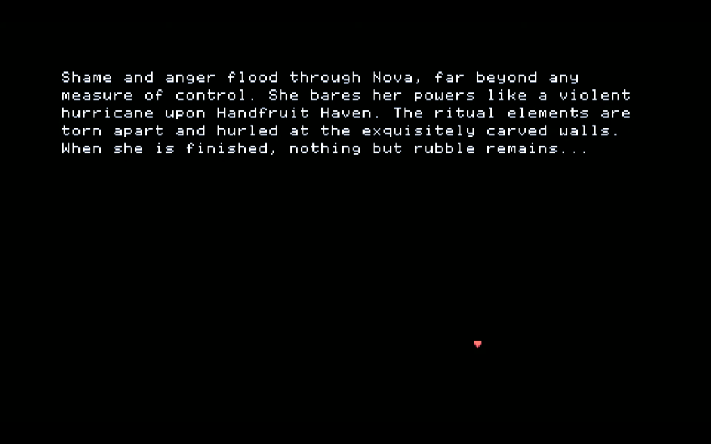 elegy affirms the inconsequentiality of how nova was born, what social role she has been confined to, and what her parents raised her to be: nova can be whoever she wants to be. it’s a simple statement, but it encapsulates so many of the game’s themes. it is an affirmation of nova’s capacity to heal, to separate from her family of origin, to embrace (gender-)queerness, and to finally quit her fucking job.