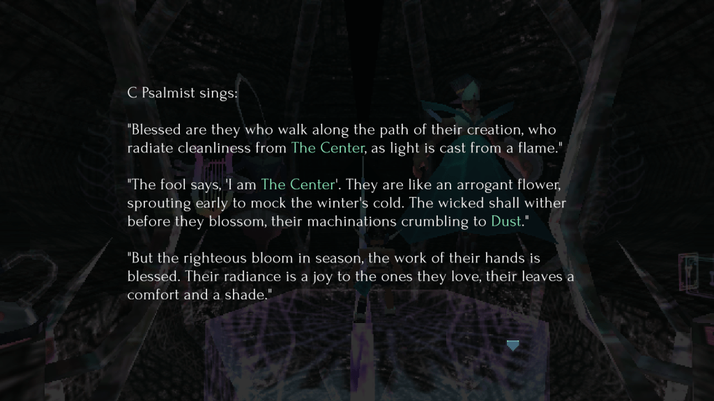 in these lines psalmist describes the body as a burden, a disgusting, onerous thing that produces and experiences suffering. if nova feels pain and discomfort in her work, it is only because the body is an inherently shoddy, decaying construction. flesh and blood are mortal, and therefore doomed. the only joy that nova can hope to find is in the perfect and everlasting beauty of the center.