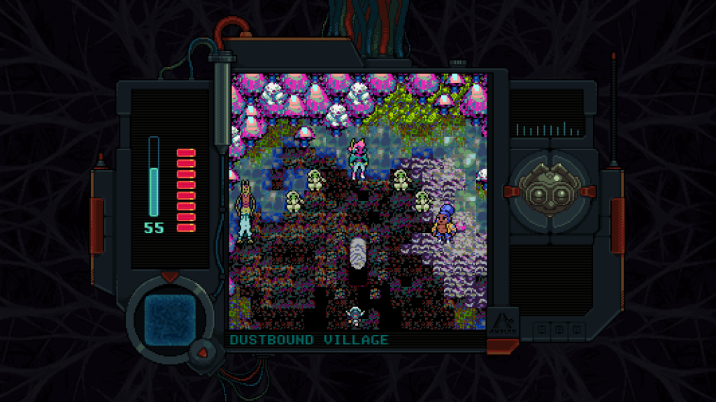 dustbound is the revolutionary heart of anodyne 2. i know the word “revolution” tends to stoke images of armed conflict, the proletariat rising up and guillotining the rich. and the game doesn’t shy away from this idea of revolution, either–in the end, the center’s agents have to be defeated in order to end the center’s violence. however, ano2 arguably seems less interested in showing us what we must destroy than what we must fight to create. it pushes us not only to envision capitalism’s destruction, but to envision a society that doesn’t reproduce capitalist thinking and colonial violence.